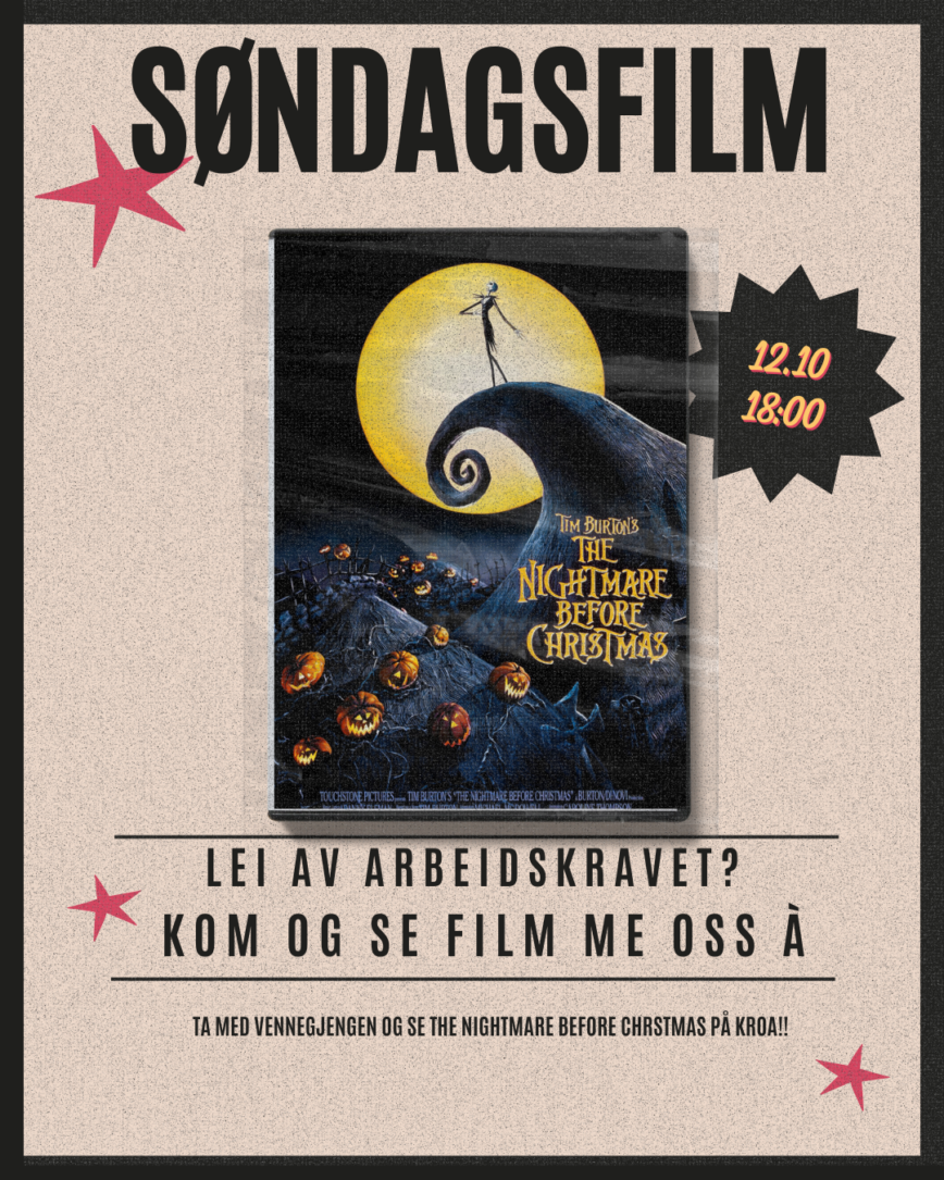 Ta med deg vennegjengen og se the nightmare before christmas. Den vil vises på storskjermen på kroa klokken 17.00 den 12.10!! Kom som du er, kosebukser og pysj er valid outfit her.